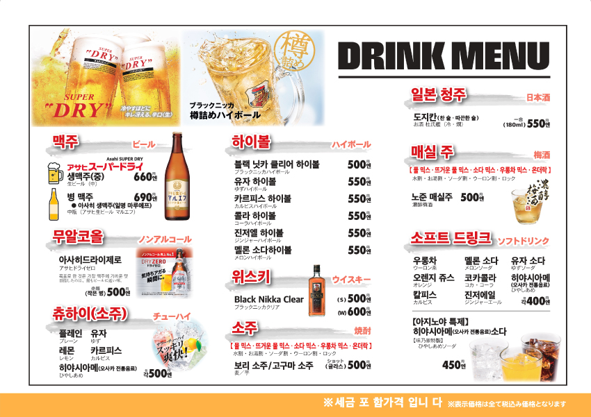 맥주, 츄하이, 위스키, 하이볼 등 각종 취급하고 있습니다.